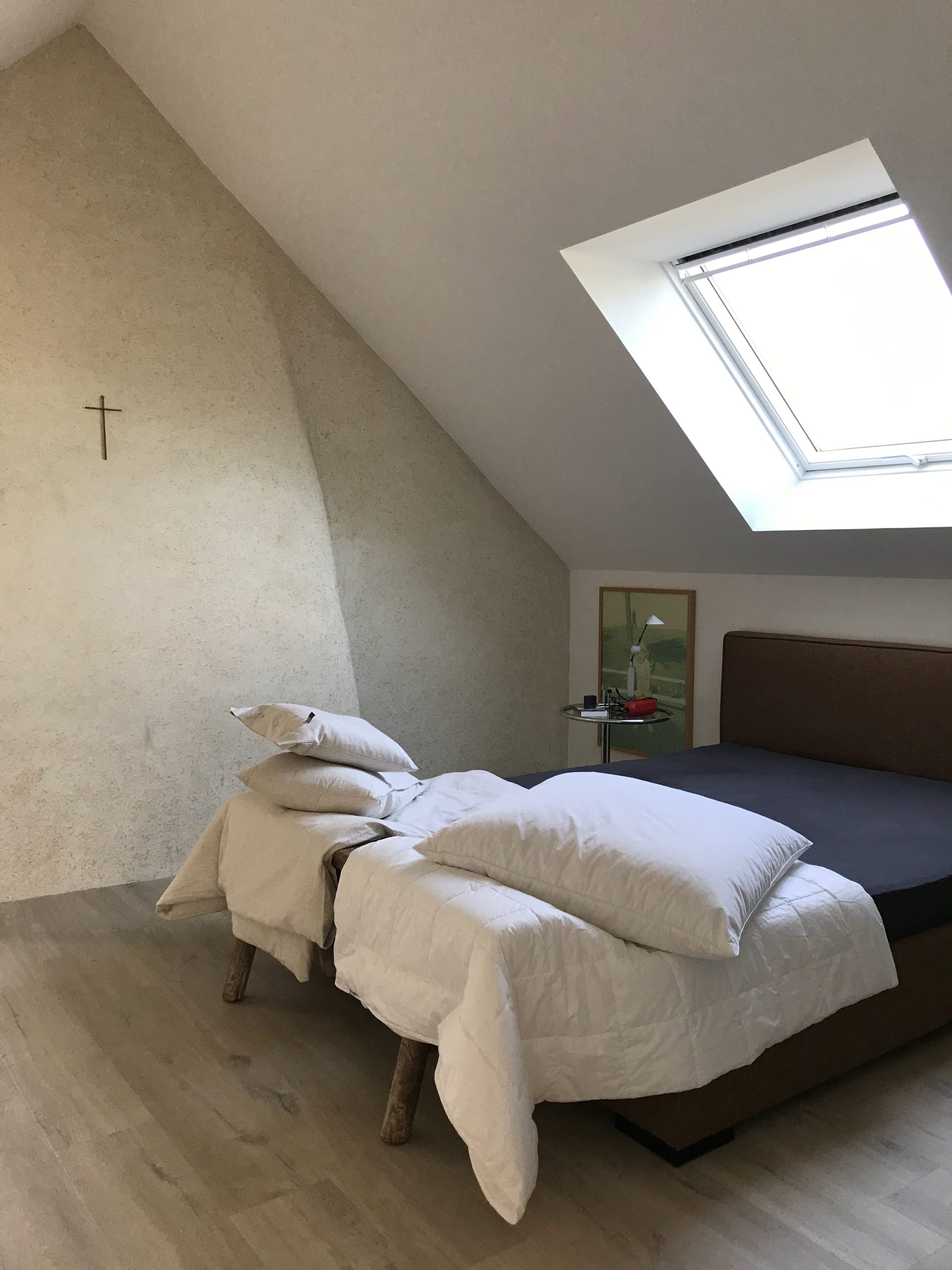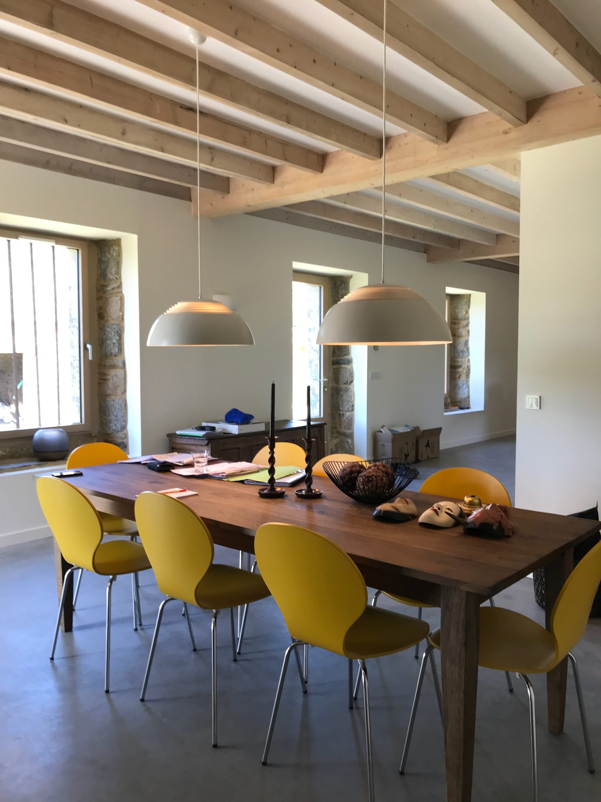 A thick lime-hemp render was applied internally to the principal façade, providing a significant thermal correction while allowing the natural curvature of the irregular walls to be maintained. The other external walls benefit from higher levels of insulation, enabling the heating system—an air-source heat pump with underfloor heating, delivered through a simple polished concrete floor—to operate efficiently.