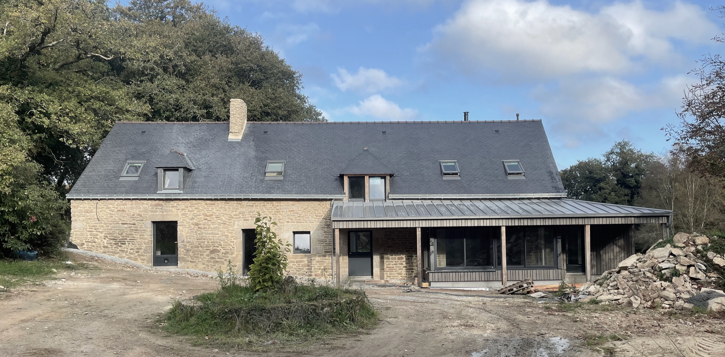 « enveloppe » contemporaine, l’extension préserve le caractère du bâtiment en pierre existant tout en l’enrichissant d’une intervention moderne et sensible. - Espaces extérieurs abrités : Le débord de toiture crée également un porche d’entrée couvert et une terrasse protégée, adaptés aux saisons parfois humides de Bretagne.