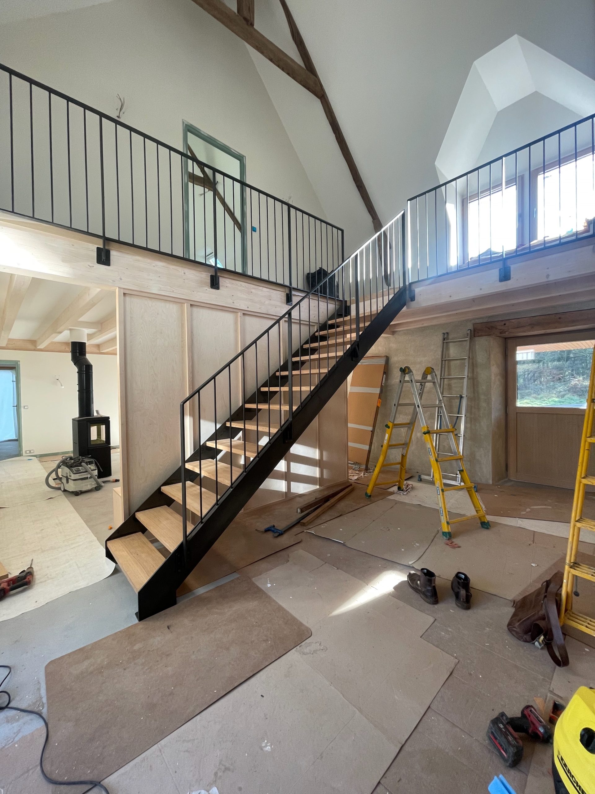 À l’intérieur, le hall central s’étend sur toute la hauteur sous la toiture inclinée et intègre un escalier en acier et une passerelle galerie. Le rez-de-chaussée largement ouvert est partiellement structuré par des bibliothèques en contreplaqué plaqué bouleau, créant un espace de vie cosy autour d’un poêle à bois et se prolongeant dans les sièges intégrés en contreplaqué plaqué bouleau de l’extension.